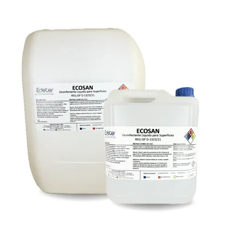 Ecosan es un líquido desinfectante con Amonio Cuaternario en formatos de 5 litros y 20 litros está diseñado para remover la suciedad en áreas industriales, como pisos y mesas de las plantas de procesamiento de alimentos. Su alta concentración permite diluir el producto, sin perder su efectividad.