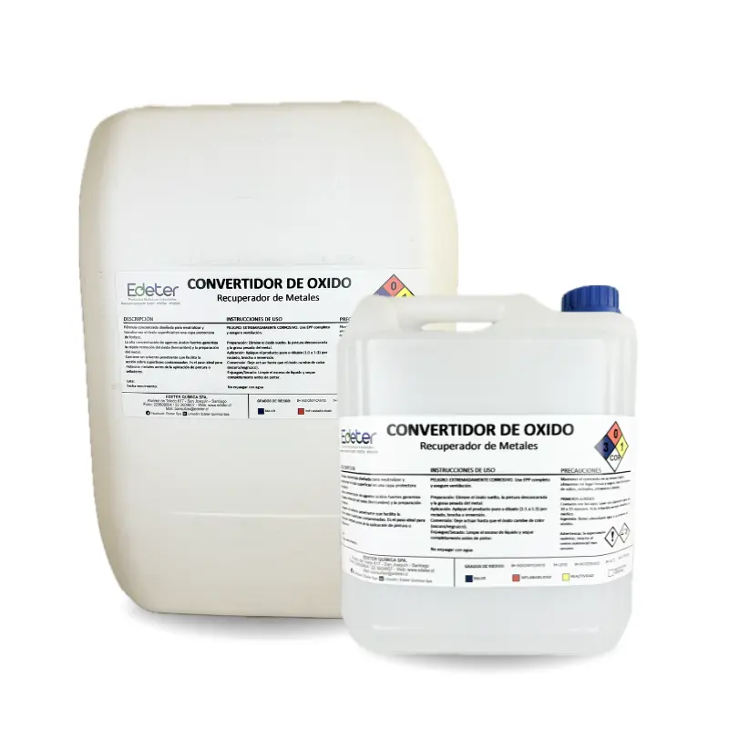 Nuestro convertidor de óxido en formatos de 5 litros y 20 litros. Su fórmula está diseñada para penetrar la oxidación y detener su avance, formando una capa protectora que protege las estructuras metálicas. Ideal para metales expuestas a condiciones agresivas.