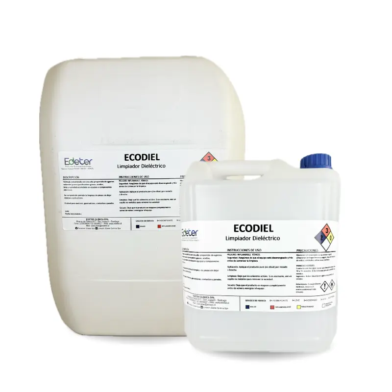 Ecodiel es un dieléctrico para limpieza de motores diseñado para remover la suciedad acumulada en equipos eléctricos. Su composición a base de solventes es compatible con gomas y barnices, manteniéndolos en su estado original sin causar daños. Se recomienda usar el producto como un limpiador en frío. Es ideal para talleres de mantenimiento eléctrico, en la minería y refinerías.