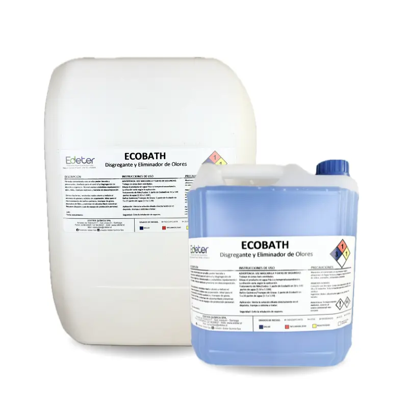 Ecobath es un disgregante químico diseñado para remover los contaminantes orgánicos. Es un poderoso deodorizante que neutralizan y eliminan los olores desagradables originados por la descomposición orgánica en colectores de agua residual, decantadores de grasa, desagües y residuos líquidos industriales (RILES).
