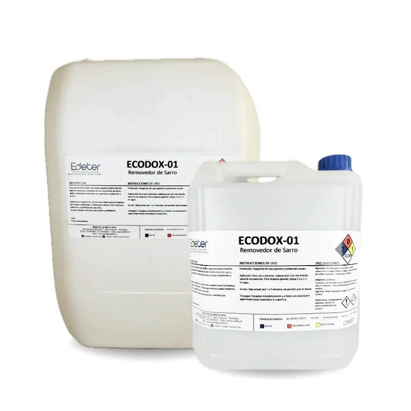 Ecodox 01 es un eliminador de sarro formulado para remover depósitos calcáreos y manchas de óxido en sanitarios, cañerías, duchas y piscinas. Es compatible con diversos materiales como cerámica, acero inoxidable, loza, azulejos y aluminio.