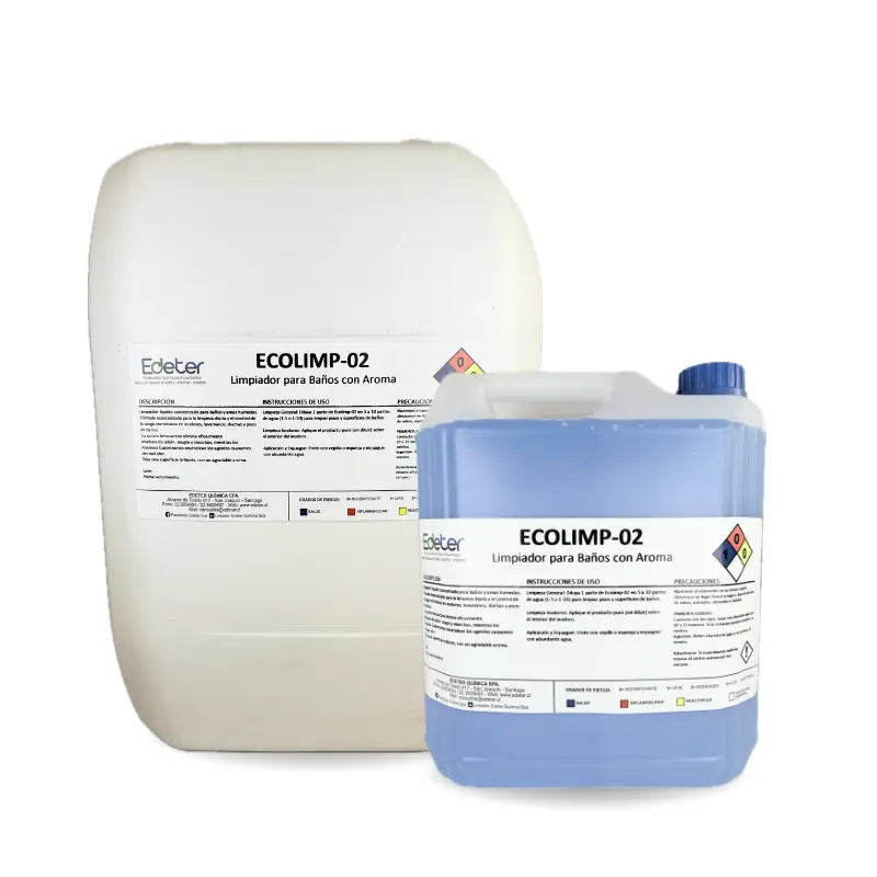 Ecolimp 02 es un limpiador de baños está diseñado para la desinfección de paredes, pisos, cerámicos, baldosas, mesones, aluminio y acero inoxidable. Ecolimp 02 contiene tensoactivos que humedecen, penetran, emulsionan y suspenden toda la suciedad, permitiendo un enjuague posterior sin residuos. Su formato de 5 litros y 2o litros se ajusta a las necesidades de diferentes áreas industriales.