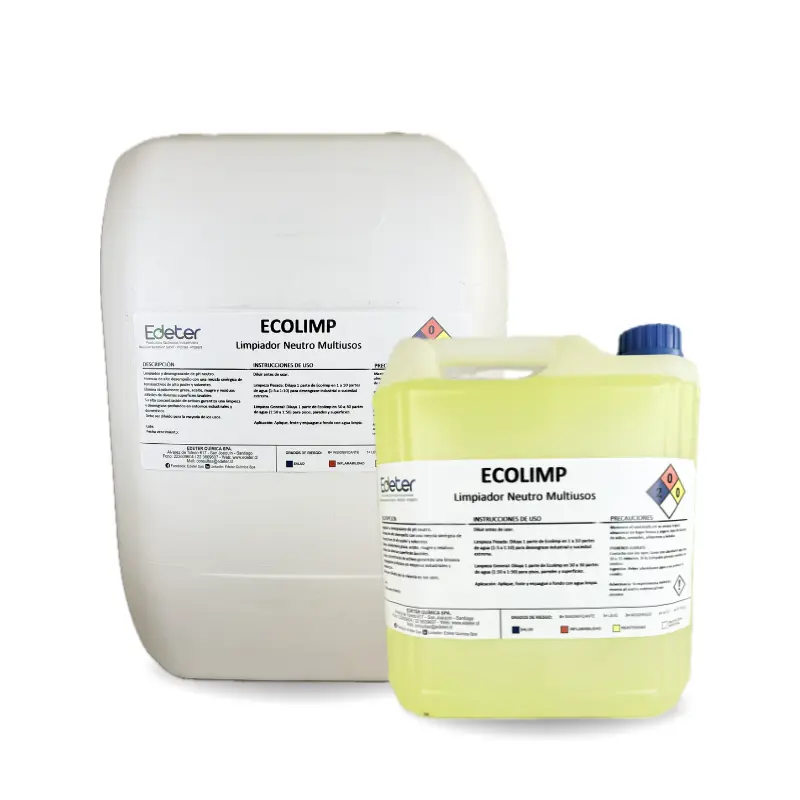 Ecolimp es un limpiador multiuso es un concentrado diseñado para penetrar la grasa y suciedad. Es un producto que mantiene las superficies libres de agentes contaminantes que pueden ser perjudiciales para la salud. Su balanceada formulación y elevada concentración acepta altas diluciones, dependiendo del tipo de suciedad a tratar y la naturaleza de la superficie a limpiar. Ecolimp es de fácil enjuague, lo que permite una aplicación sencilla y eficaz.