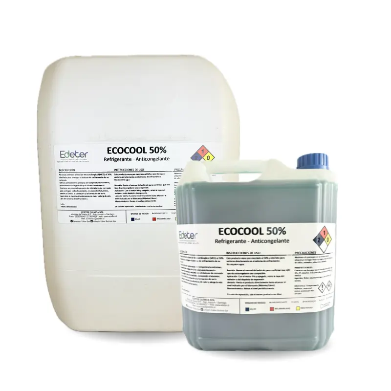Ecocool 50% es un líquido anticongelante 50 por ciento diseñado para entregar una protección extrema en los sistemas de refrigeración. Previene el congelamiento y sobrecalentamiento en equipos pesados y motores industriales. Este producto garantiza la máxima transferencia de calor, alargando la vida útil de la máquina o vehículo.