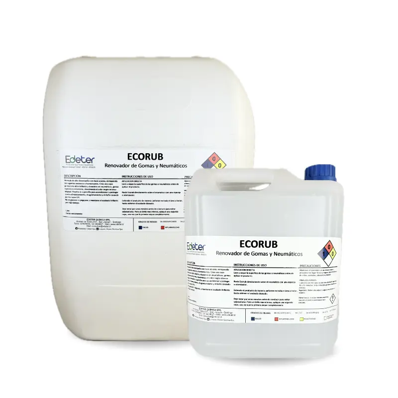 Ecorub es un líquido renovador de neumáticos diseñado para mejorar y renovar la apariencia de las superficies de goma. Con una sola aplicación, Ecorub revitaliza el color y la textura original. Este producto entrega resultados al instante, asegurando superficies como nuevas. No deja residuos grasos ni contiene componentes tóxicos, lo que garantiza un uso seguro en todo tipo de trabajos.